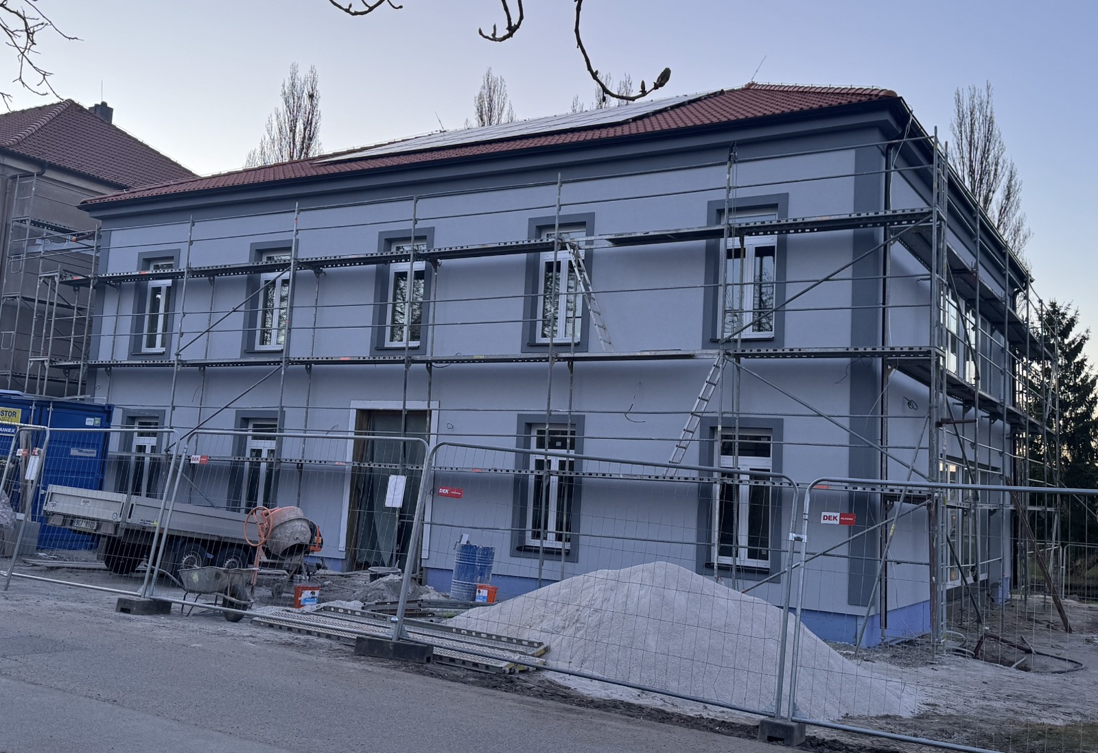 Vnější omítky jsou již z větší části dokončeny a budova tak postupně získává svou finální podobu. Jedním z nejnáročnějších kroků byl výběr barevnosti fasády. Po pečlivém zvažování jsme se nakonec rozhodli pro decentní, tlumené odstíny, které působí klidně a přirozeně. Zároveň budou do budoucna ladit s fasádou obecního úřadu, až projde plánovanou úpravou.